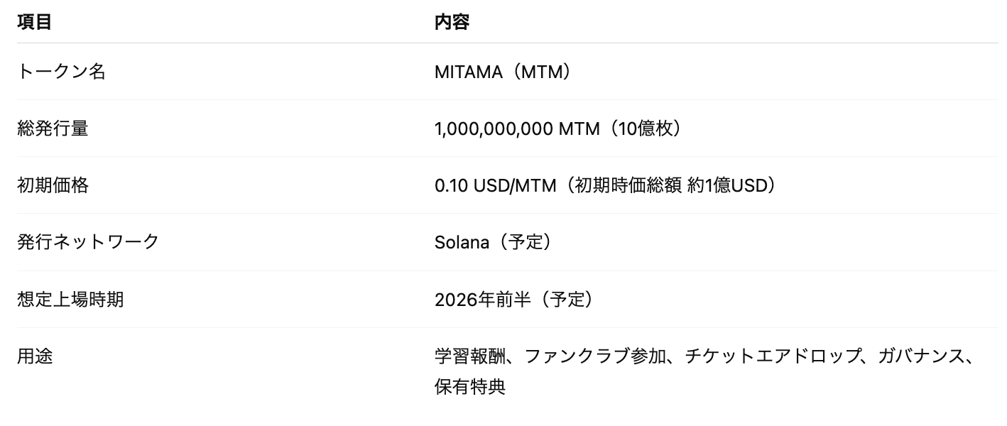 MITAMAトークン(MTM)は、MITAMA経済圏の中核となるユーティリティトークンです。教育・学習・コミュニティを基盤としたファンクラブ型エコシステム内で機能し、ユーザー行動が直接トークンの流動性と市場価値に反映される設計を採用しています。